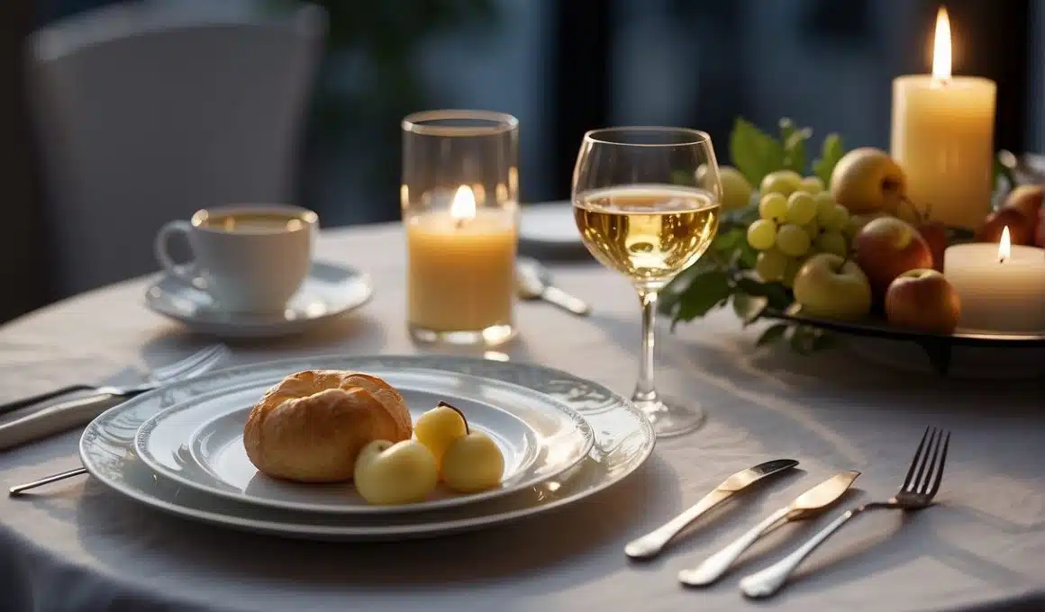 A table set with a white tablecloth, adorned with a plate of perfectly arranged pomme parisienne, a glass of wine, and a flickering candle